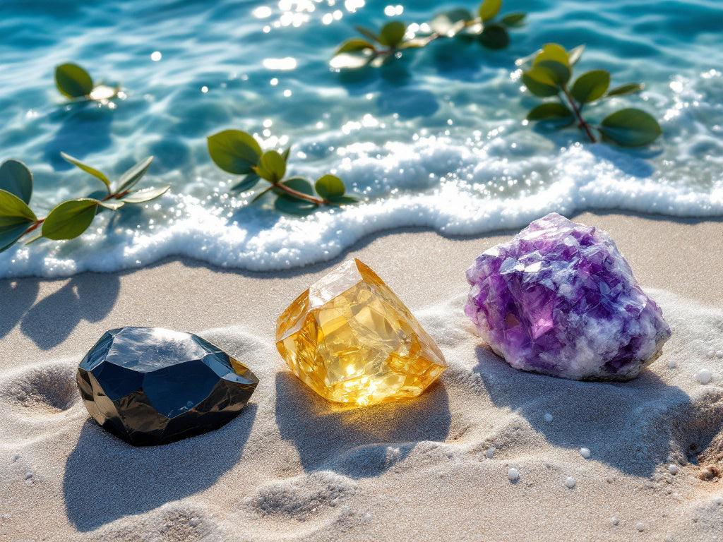 Sea Salt Eucalyptus Crystal Candle with Black Obsidian, Citrine, and Amethyst | Coconut-Soy Wax Candle, 9oz