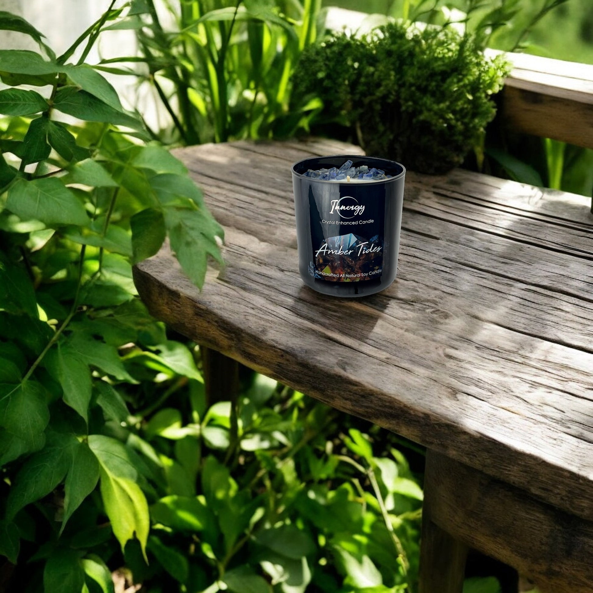 Experience tranquility and harmony with the Amber Tides Kyanite Crystal Candle from Innergy. Surround yourself with the soothing "Amber Tides" aroma, a serene blend of sandalwood, musk, and driftwood. Enhanced with Kyanite crystals, known for their balancing properties. These crystals enrich your environment, fostering an atmosphere of serenity and well-being. This earthy combination invites a sense of calm and balance into your surroundings.