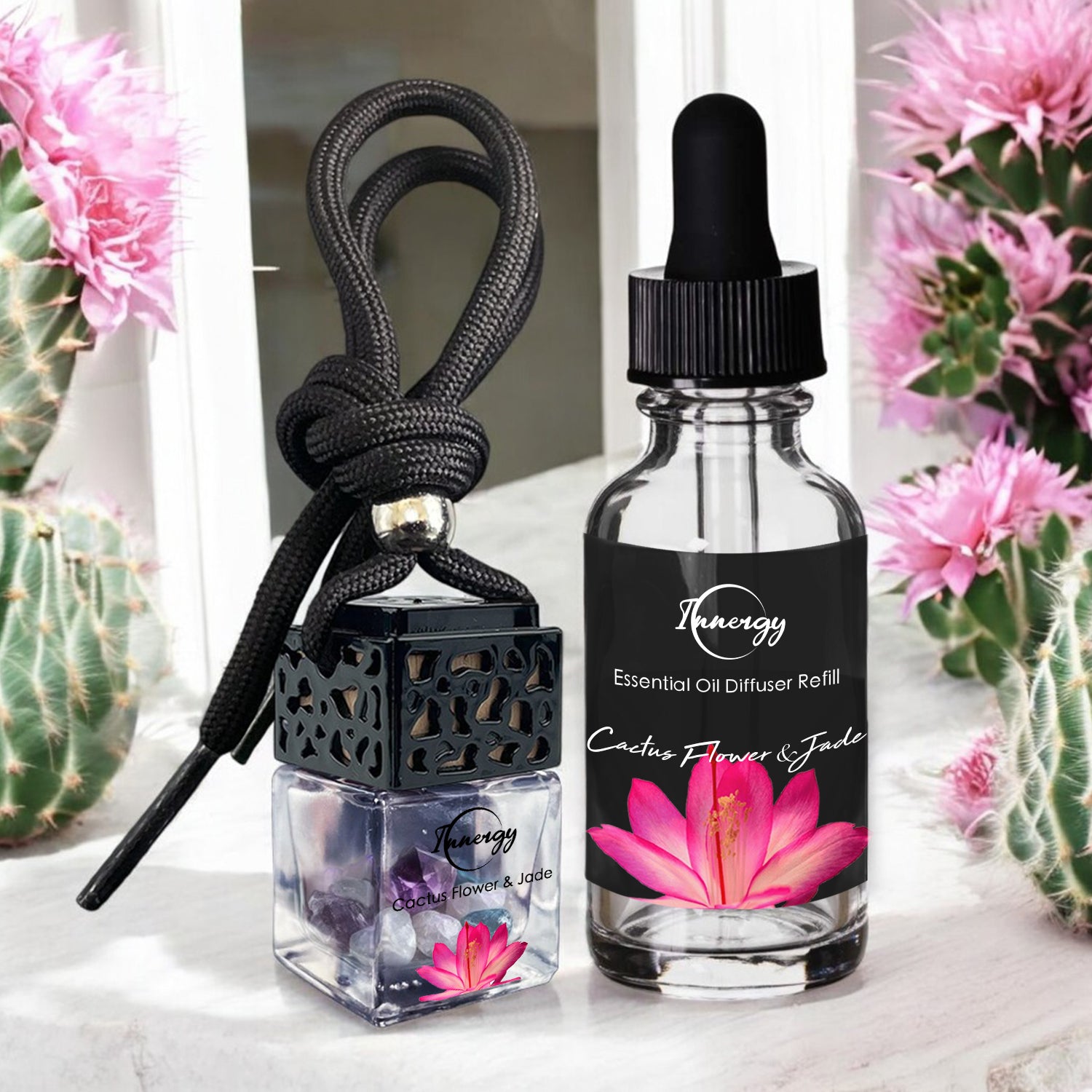 Cactus Flower and Jade Crystal-Enhanced Oil Diffuser, Car Air Freshener, 8ml
