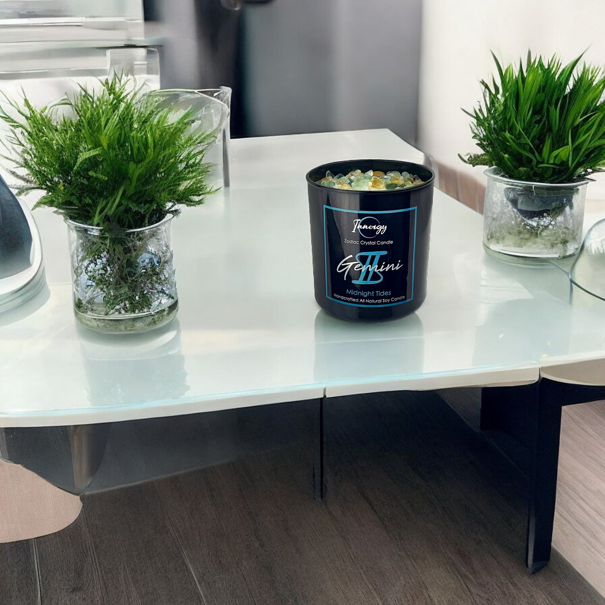 Embark on an energizing journey with our Gemini Zodiac Crystal Candle, a tribute to the endlessly curious and versatile spirit of the Gemini sign. The "Midnight Tides" scent is a captivating symphony, weaving together notes of soothing lavender, warm amber, invigorating eucalyptus, and the earthy allure of patchouli. This fragrance mirrors the multifaceted and ever-curious nature of Geminis, capturing their ability to adapt and explore the many facets of life.