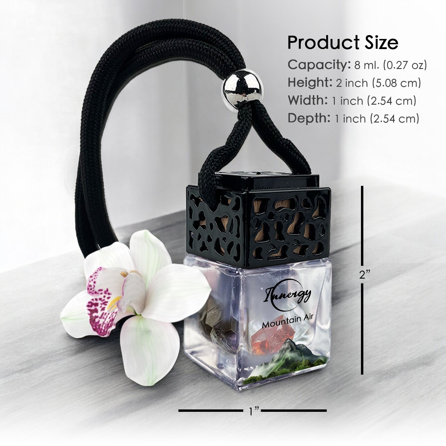 Embark on a journey of grounding and ambition with our Crystal-Enhanced Car Diffuser. Immerse yourself in the invigorating scent of Mountain Air, featuring notes of cedarwood, orange, elemi, guaiac wood, peppermint, eucalyptus, nutmeg, and birch tar—a fragrance curated to resonate with the determined and earthy spirit.
