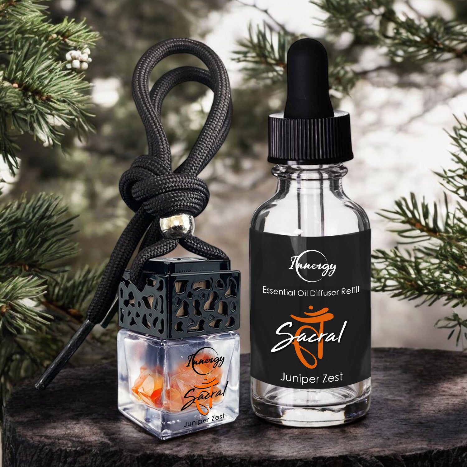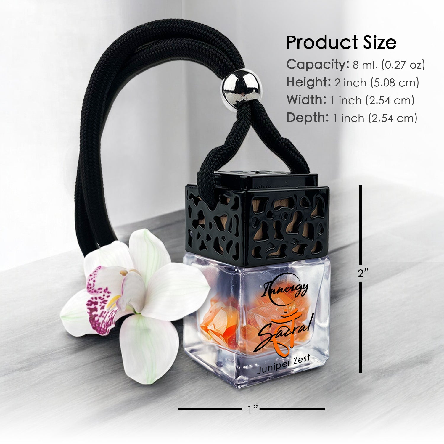 Indulge your senses in the enchanting allure of our Chakra Crystal-Enhanced Car Diffuser, with the captivating Juniper Zest scent—a harmonious blend of tart and sweet notes. Botanical juniper, geranium, and an elegant hint of black currant and peppermint, that reinforces the tart freshness.