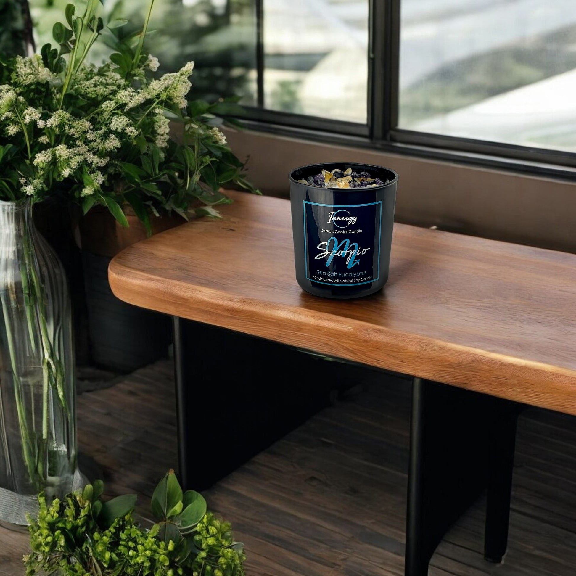 Delve into the enigmatic depths of the Scorpius (Scorpio) Zodiac Crystal Candle, expertly crafted to embody the intense and transformative spirit of Scorpio. The "Sea Salt Eucalyptus" scent is a masterful blend, combining the crispness of sea salts with the resinous aroma of juniper, the invigorating essence of eucalyptus, and a soothing marine mist. This complex fragrance mirrors the multifaceted nature of Scorpio – deep, mysterious, and irresistibly alluring.