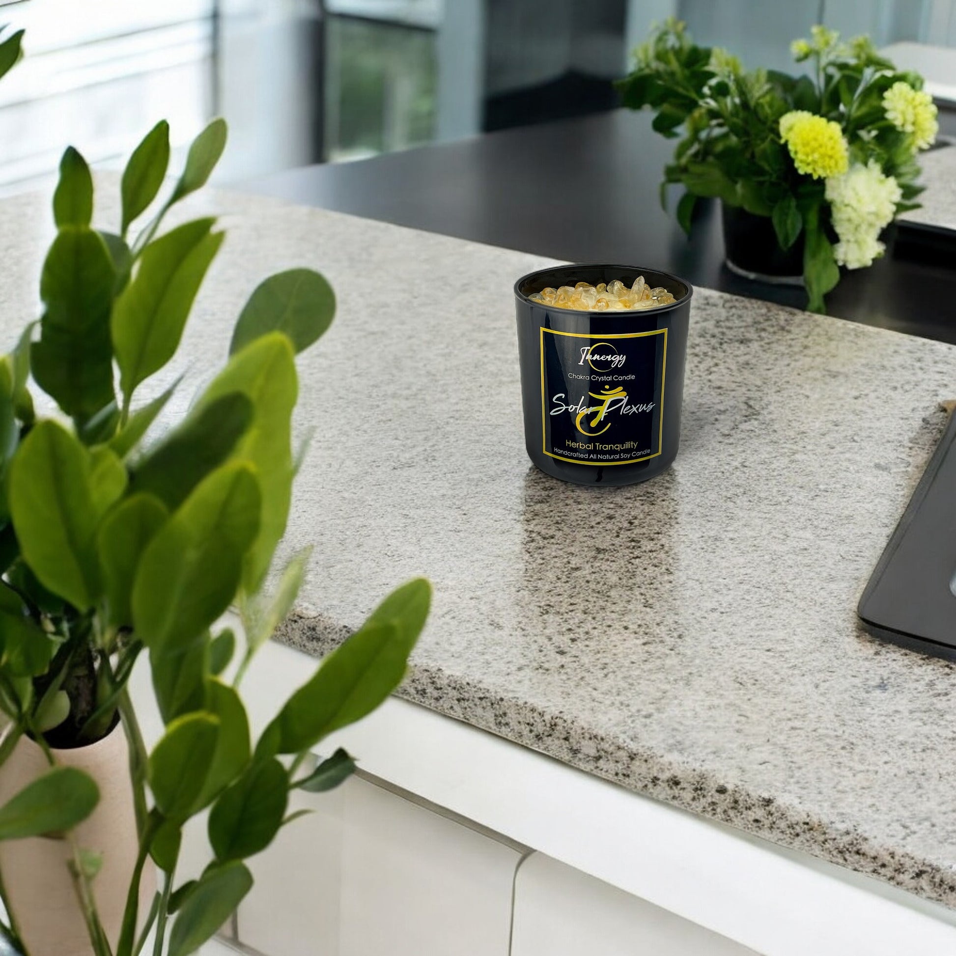 Elevate your spirit and balance your energies with our Solar Plexus Chakra Crystal Candle by Innergy. Bask in the serene embrace of our Herbal Tranquility scent, a masterful blend of fir needle, eucalyptus, and cedar leaf essential oils. This composition captures the essence of the Solar Plexus Chakra, creating a space of empowerment and self-confidence.