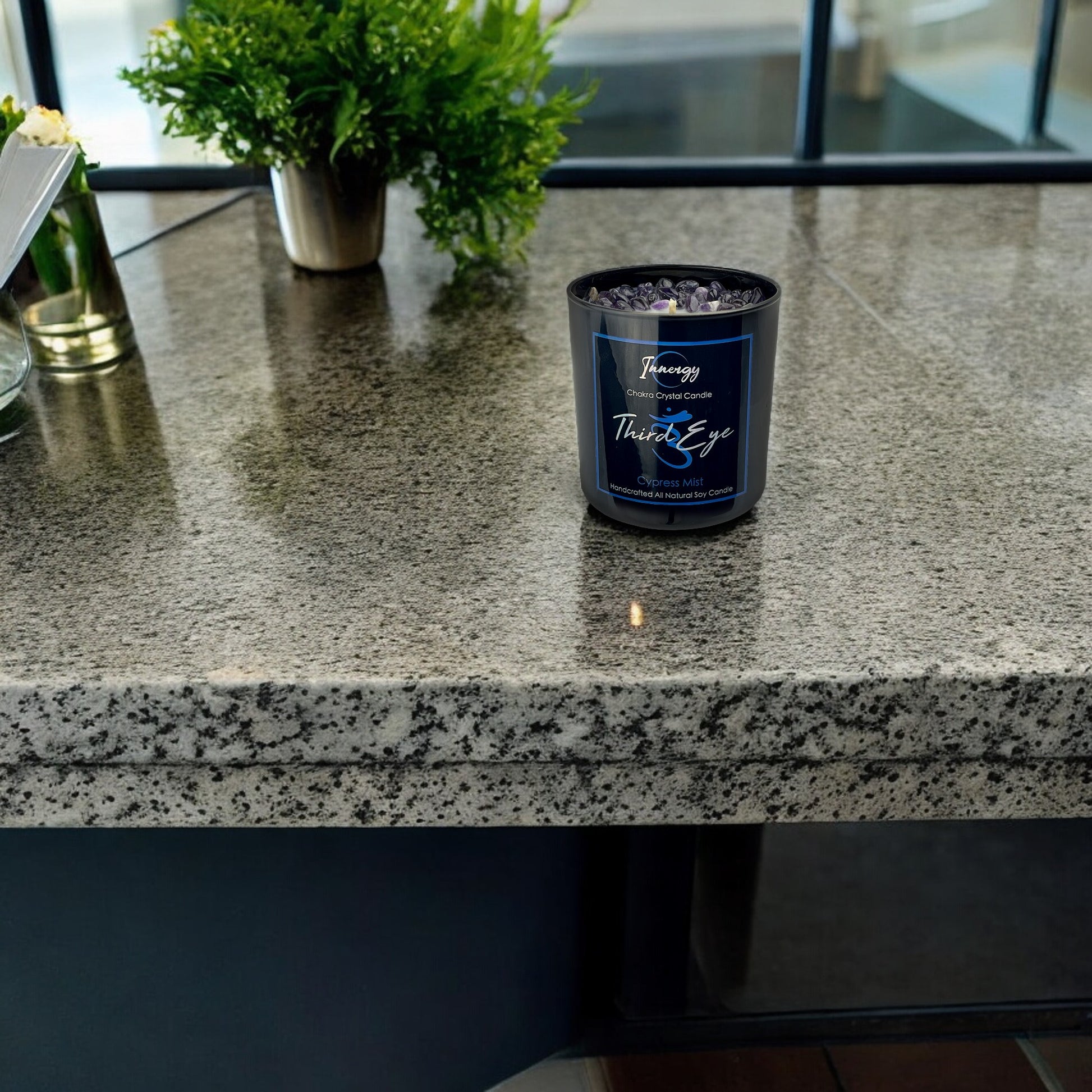Awaken your intuition and enhance spiritual clarity with the Third-Eye Chakra Crystal Candle from Innergy. Delve into the depths of the "Cypress Mist" scent, a sophisticated symphony that begins with the crisp, invigorating freshness of eucalyptus. This evolves into a verdant heart of cypress, moss, and bayberry, grounded in rich undertones of fir, patchouli, and sweet incense. This complex fragrance is meticulously aligned with the Third Eye Chakra, creating an atmosphere of insight and tranquility.