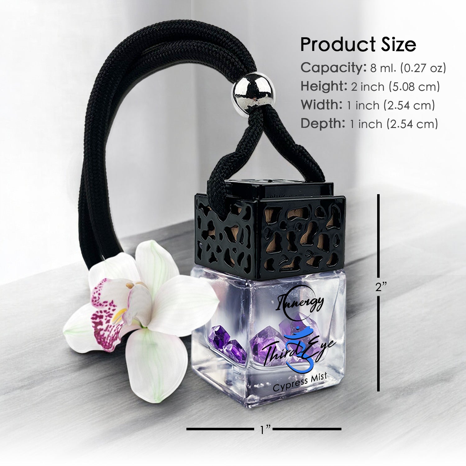 Embark on a journey of heightened awareness with our Crystal-Enhanced Car Diffuser, now infused with the "Cypress Mist" scent—a sophisticated blend that opens with the cool freshness of eucalyptus, seamlessly transitioning into the heart of cypress, moss, and bayberry, with rich undertones of fir, patchouli, and sweet incense.
